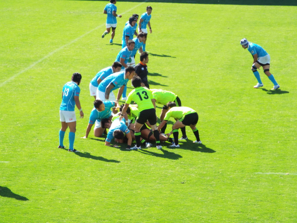 この写真ではラックが形成されているので、水色の16番の選手がプレーに参加すればオフサイドの反則となる