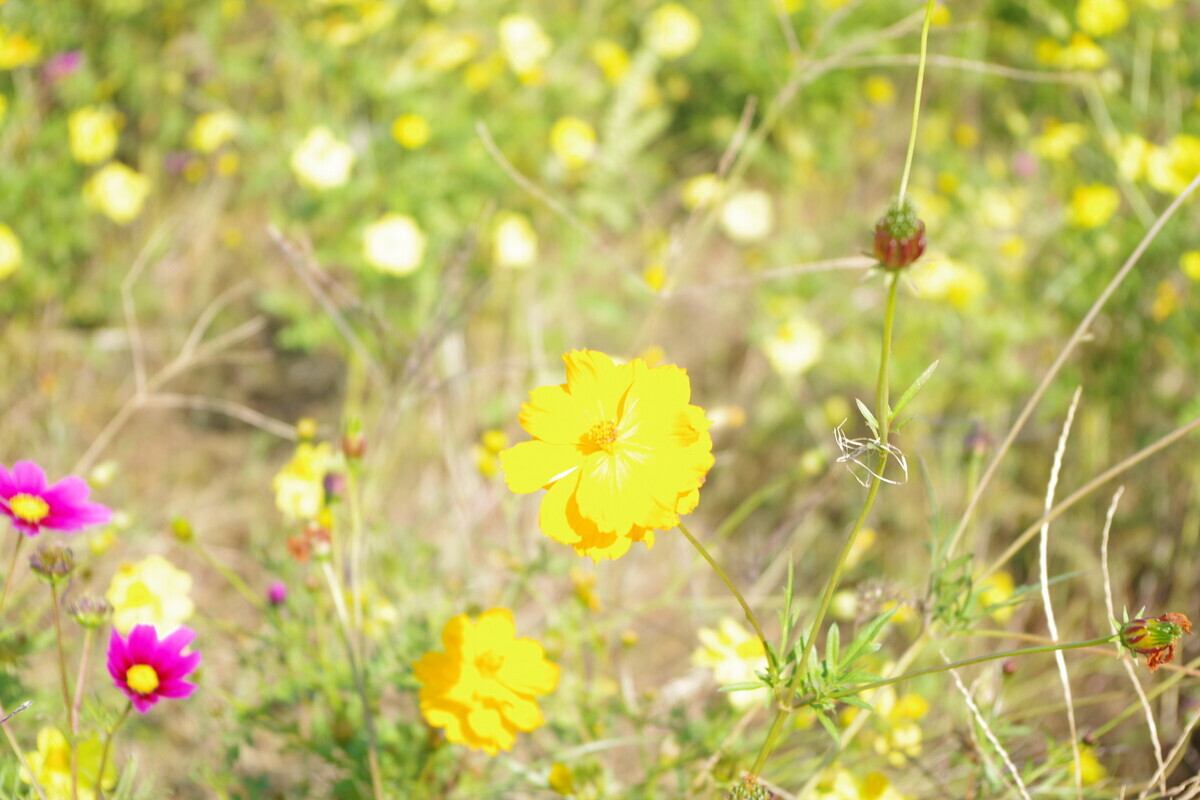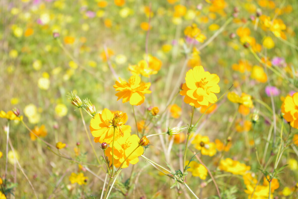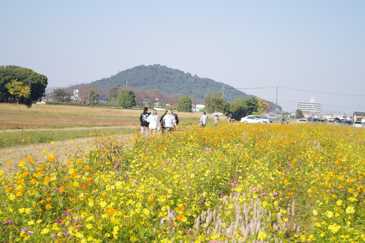 ▼朝堂院東ゾーンのキバナコスモスと耳成山